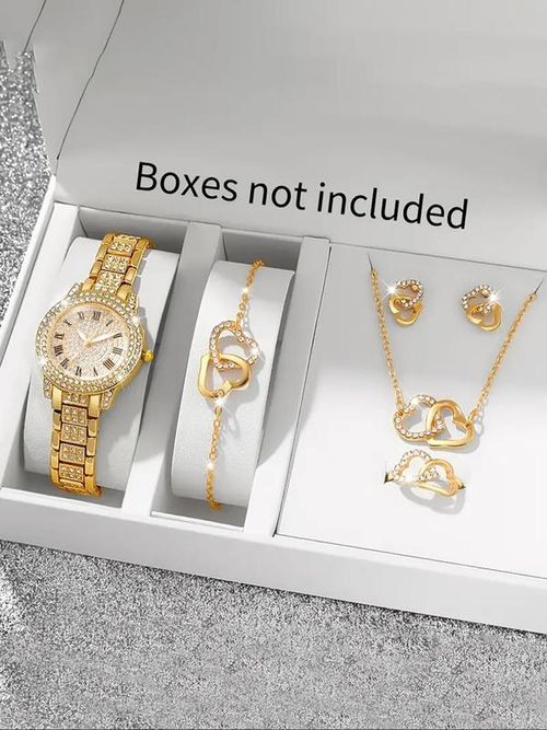 Women's Elegant Fashion Watch & Jewelry Set, Round Dial Analog Quartz Watch & Bracelet & Necklace & Ring & Earrings, Exquisite Watch Set with Box, Fashionable Jewelry Set