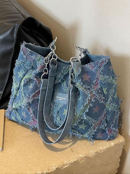 Women's Fashionable Star Pattern Raw Trim Tote Bag, Large Capacity Shoulder Bag, Elegant Commuter Rhombus Bag, High-capacity Denim High-sense Bag, Fashionable Patterned Bag, Suitable for Dating, Classes, Shopping