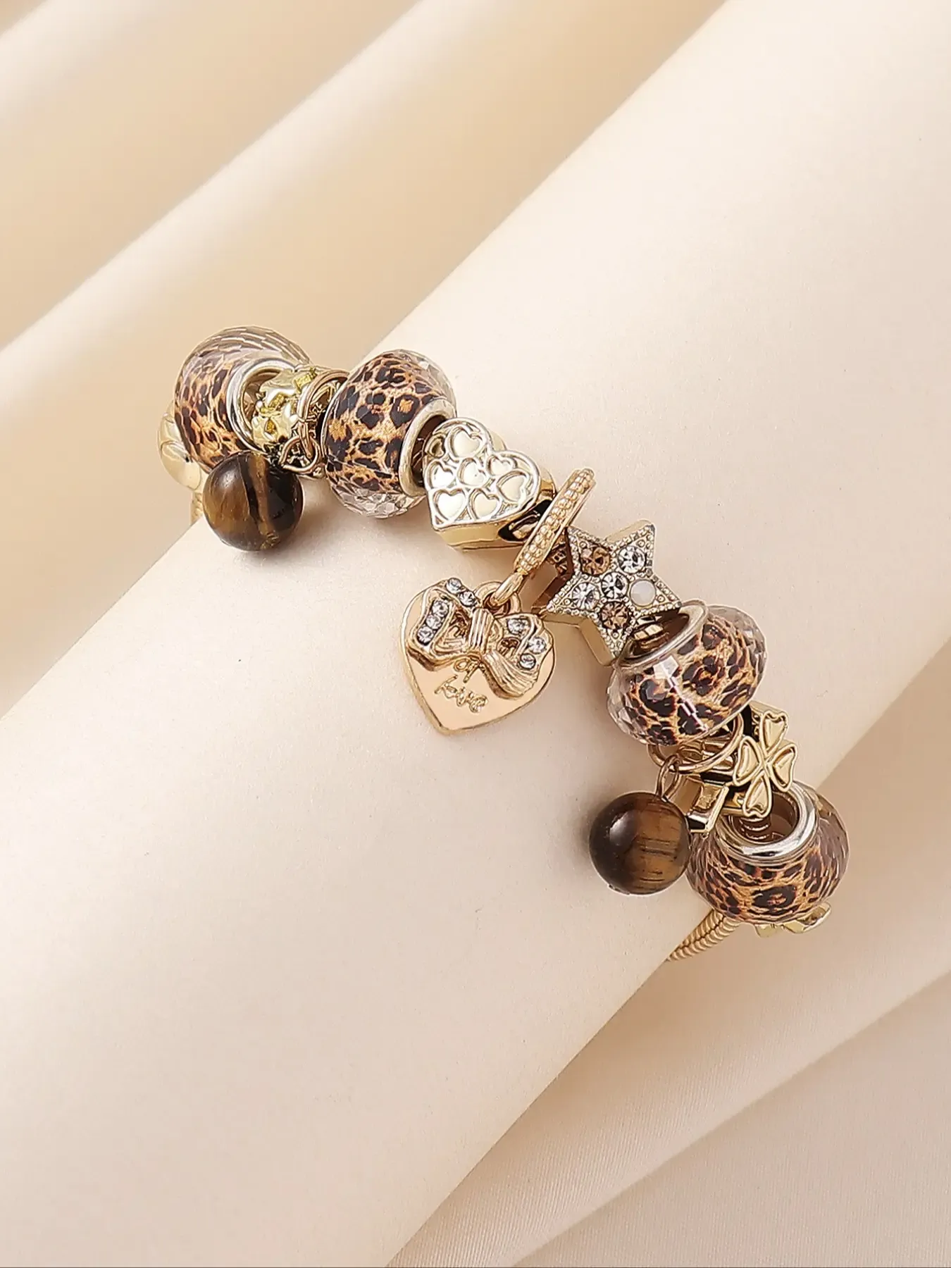 Women's Leopard Print Beaded Bracelet with Bow, Heart, Clover and Tiger Eye Stone, Trendy Fashion Jewelry, Heart Shaped Bracelet, Heart Charm Bracelet, Perfect for Parties, Nights Out and Daily Wear