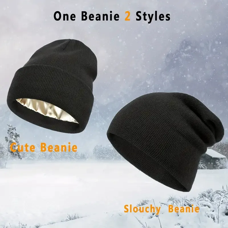 Fall Winter Unisex Satin Lined Knit Beanie - Windproof Warm Hair Protection Hat, Outdoor Cold Weather Thermal Skull Cap