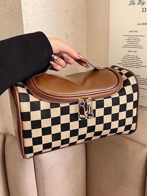Fashion Colorblock Checked Pattern Makeup Bag, Casual Versatile Zipper Makeup Pu Leather Storage Bag, Makeup Organizer Pouch for Women & Girls